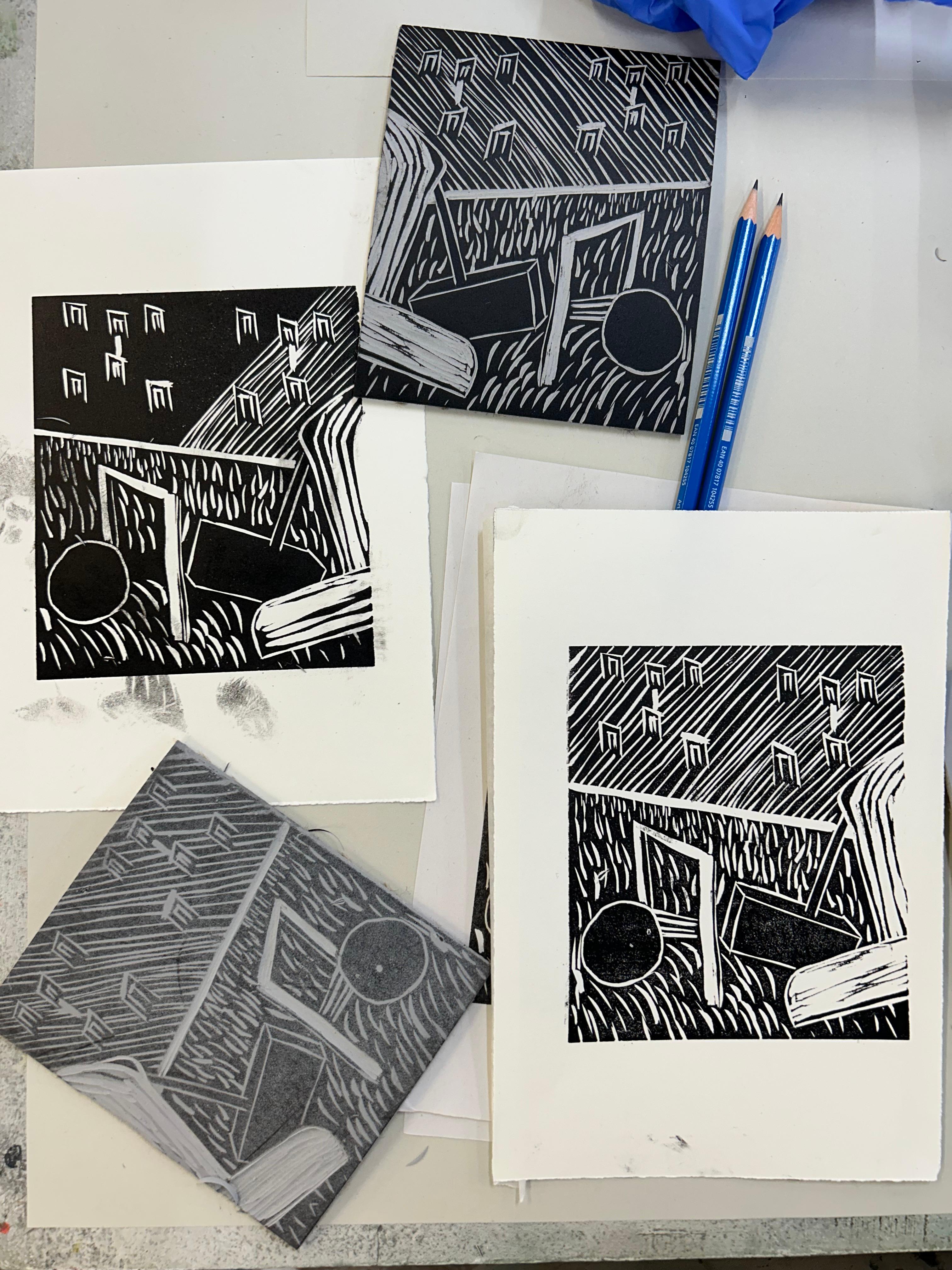 You will be introduced to the principles of simple multiblock linocut through examples. Then you will work towards creating a 2 layer lino, alongside registration of your block and layered colour.