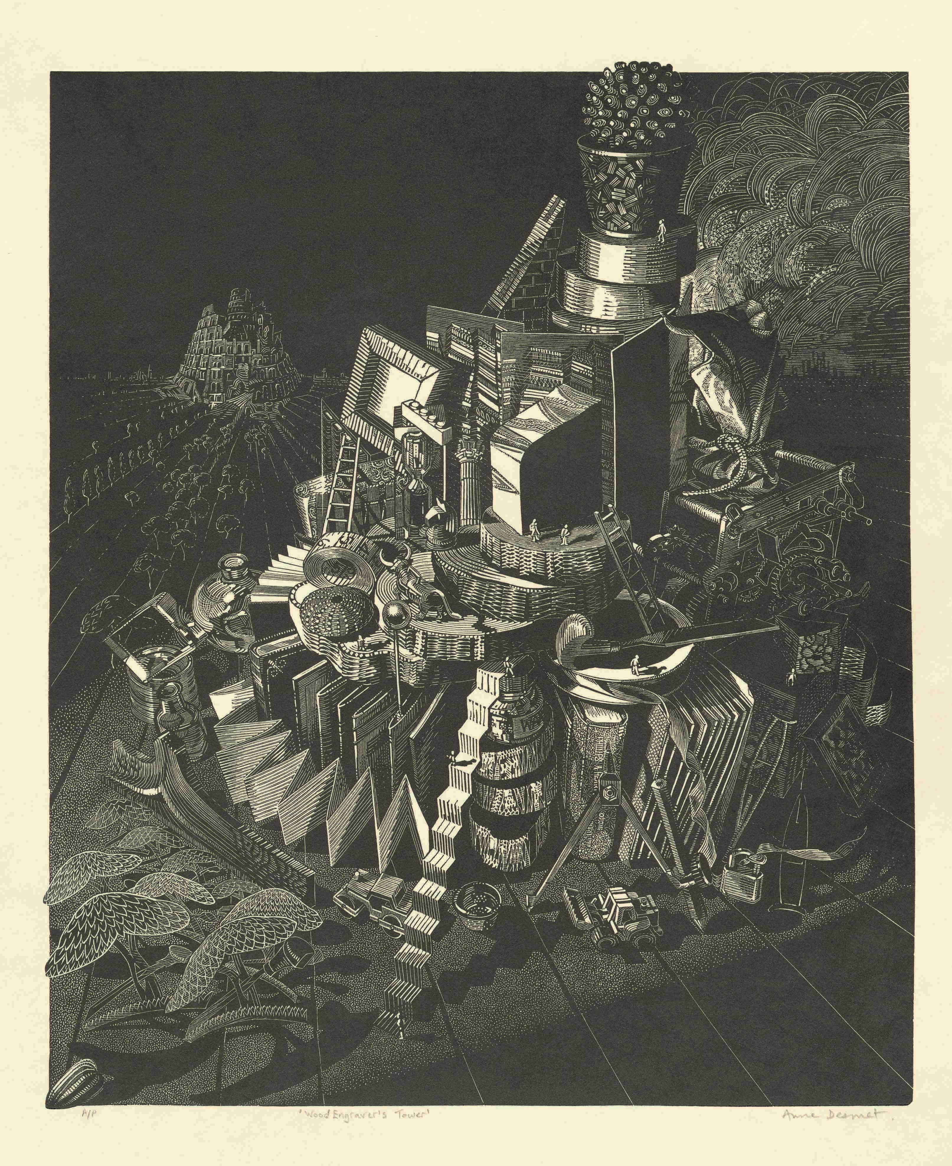 Anne Desmet RA was born in Liverpool, studying at Oxford University and London’s Central School of Art. Elected Hon. Fellow of Worcester College Oxford (2018) for ‘distinction in the world of art’, she has won over 40 awards (inc. Rome Scholarship in Printmaking), and has work in many public collections. The Ashmolean, Whitworth, Pallant House and V&A have substantial holdings of her engravings and collages. Over 50 solo exhibitions include museums in Moscow, Brazil, Italy, and at the UK’s Ashmolean, Whitworth; Holburne; Gainsborough’s House; Pallant House; Guildhall Art Gallery and, most recently, Escher in the Palace Museum, The Hague (2025-26). Commissions inc. engravings for the British Museum; National Gallery; British Library; V&A; Sotheby’s and Royal Mint. Editor of Printmaking Today (1998-2013), Desmet has authored eight books inc. Wood Engraving – A Personal Approach (Crowood Press, 2025). Only the third wood engraver ever elected to the Royal Academy of Arts, she lives in London and is represented by Eames Fine Art www.eamesfineart.com